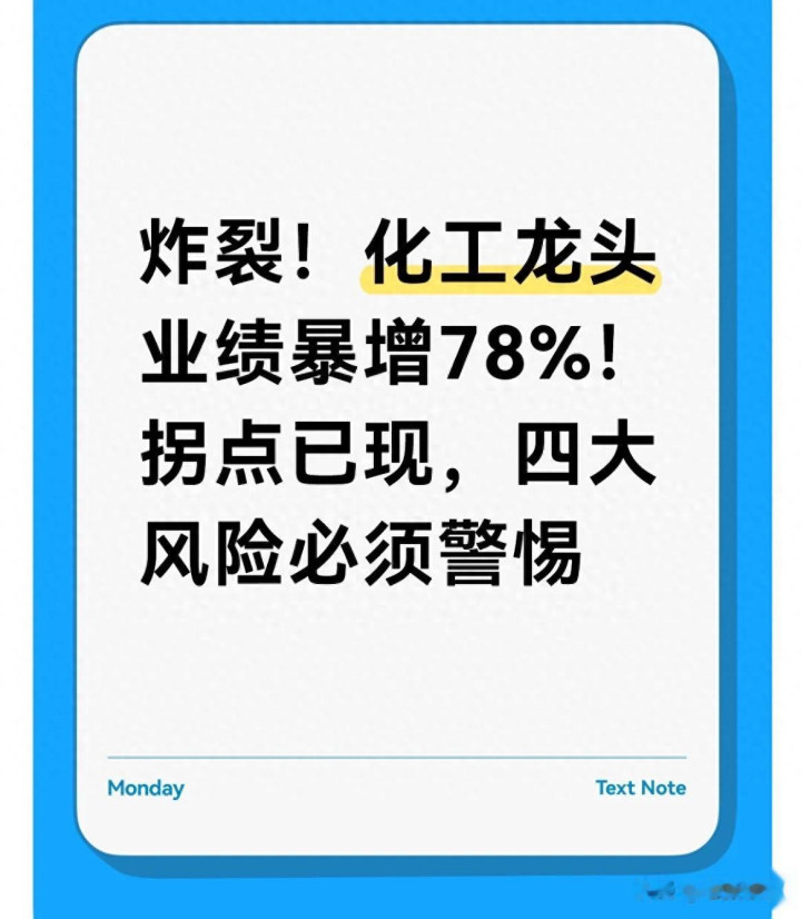 今天讲的这只化工龙头,主营业务业绩暴增、拐点明确,是真机会,但也伴随着实实在在的四大风险。我会把机会和风险都讲得明明白白,让大家理性布局,不踩坑、不站岗!